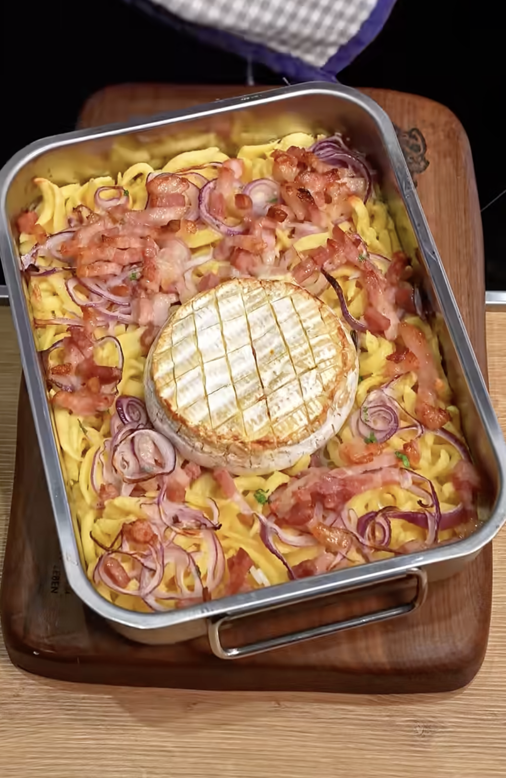 Spätzle in eine Auflaufform geben. Ofenkäse oben leicht einschneiden und dazu legen.