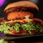 Salat, Pattie, eine Scheibe Cheddar, den heiĂźen Backcamembert, Bacon und einen Klecks Preiselbeeren schichten.