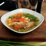 Finalisieren & Servieren: Das gezupfte Hühnchenfleisch und in Scheiben geschnittene Möhren in die heiße Brühe geben (nicht mehr kochen!). Suppennudeln separat kochen. Frühlingszwiebeln und Petersilie fein schneiden und als Topping verwenden.